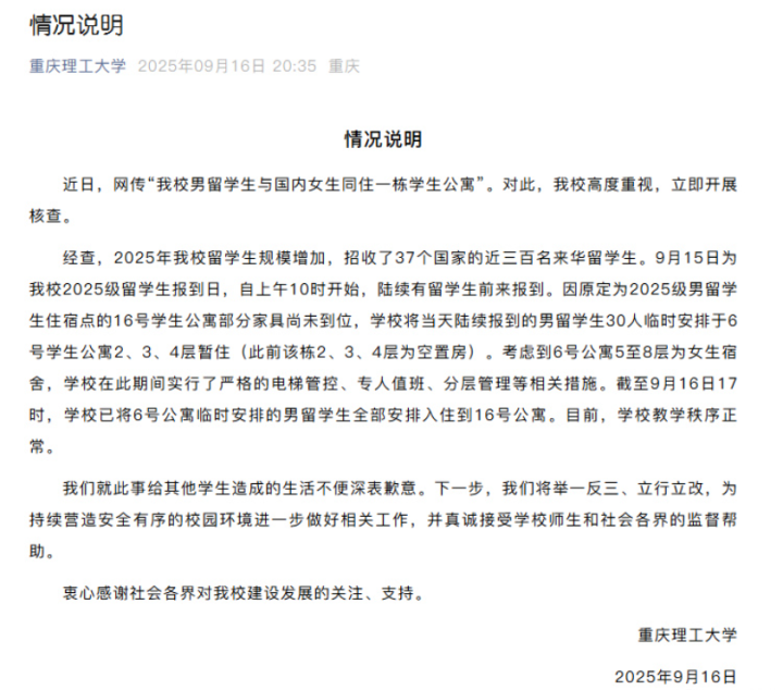 多名男性留学生混住在女生宿舍楼?重庆理工大学回应:临时安排住一天,马上搬离